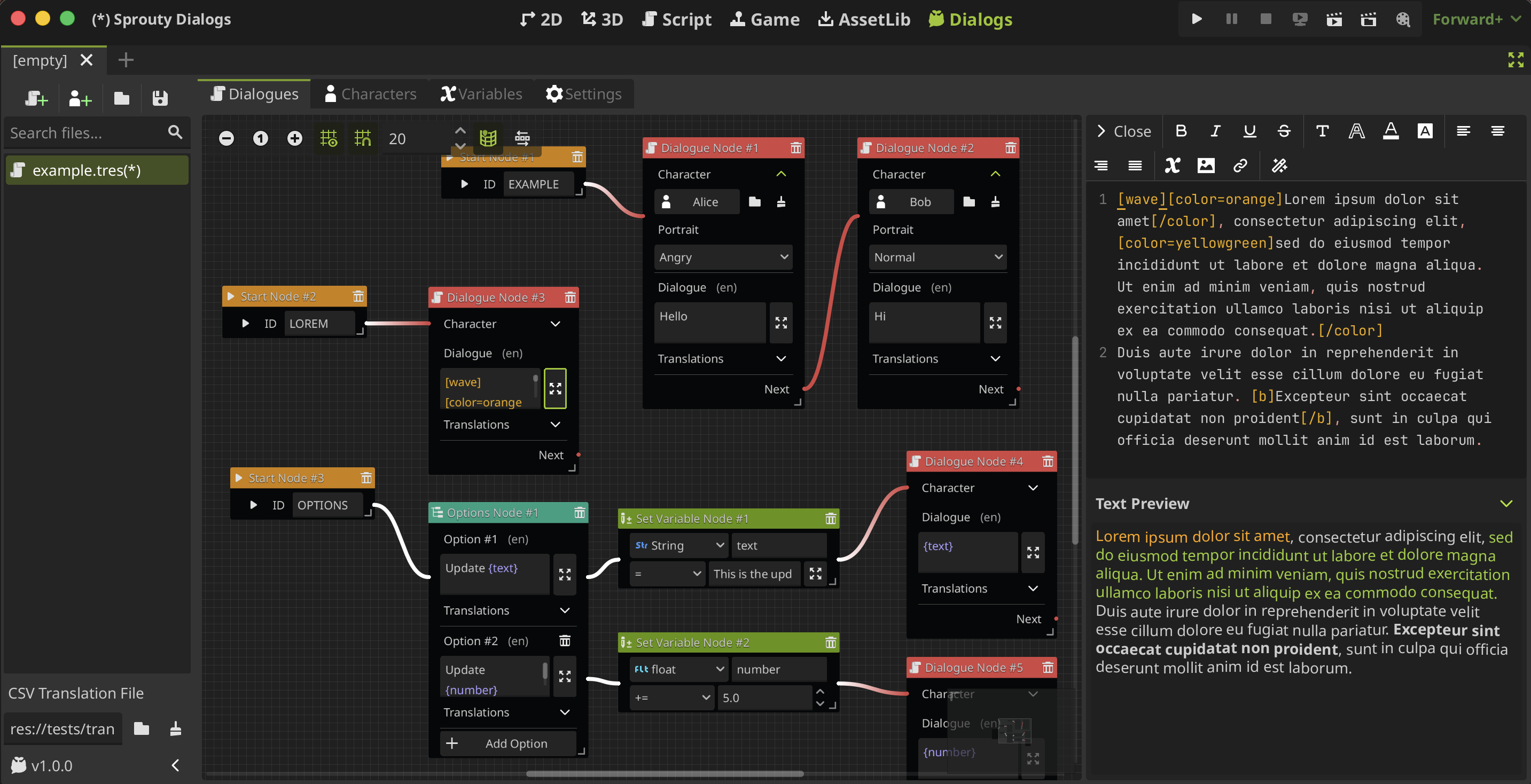 With the visual dialogue editor, you can easily create conversations and sequences in your games